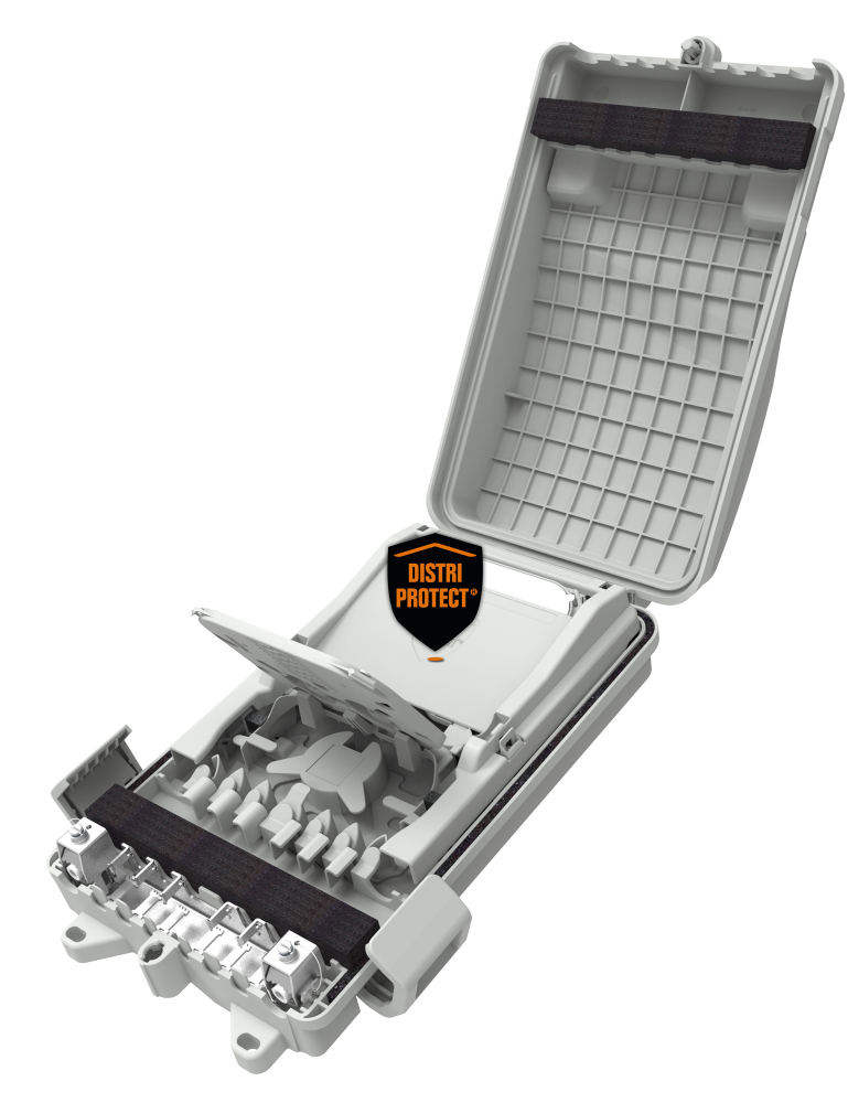 Die Distri-Protect Produktlinie wurde entwickelt, um den Anforderungen von FTTH-Installationen an Luftstützen und Fassaden gerecht zu werden. Die Gehäuse sind sehr kompakt, um das Gewicht auf den Masten zu begrenzen.